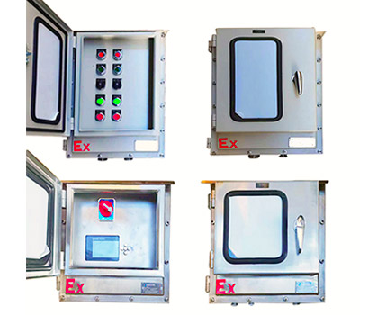 帶防護(hù)門的防爆配電箱使用于戶外天氣,雨水沙塵,拋光,噴塑,粉塵較多的環(huán)境中,有效阻止粉塵進(jìn)入箱體表面,影響箱子的使用效果增加配電箱的使用壽命。 快開門防爆箱本產(chǎn)品采用304不銹鋼焊接而成,板材厚度在5MM以上。防爆配電箱,一般用不銹鋼或鋼板焊接,也可以用鋁合金壓鑄。防爆電柜有兩種類型:IIC級防爆電柜和IIB級防爆電柜。通常,防爆電控箱是一種復(fù)合結(jié)構(gòu),也就是說,它由一個(gè)防爆腔(主腔)和一個(gè)增安型腔組成。其中小型斷路器、塑殼斷路器、熱繼電器、交流接觸器、電涌保護(hù)器、電動機(jī)保護(hù)器等元件可安裝在隔爆腔內(nèi),防爆按鈕、防爆指示器、防爆轉(zhuǎn)換開關(guān)、防爆儀表等可安裝在增安型腔內(nèi)。